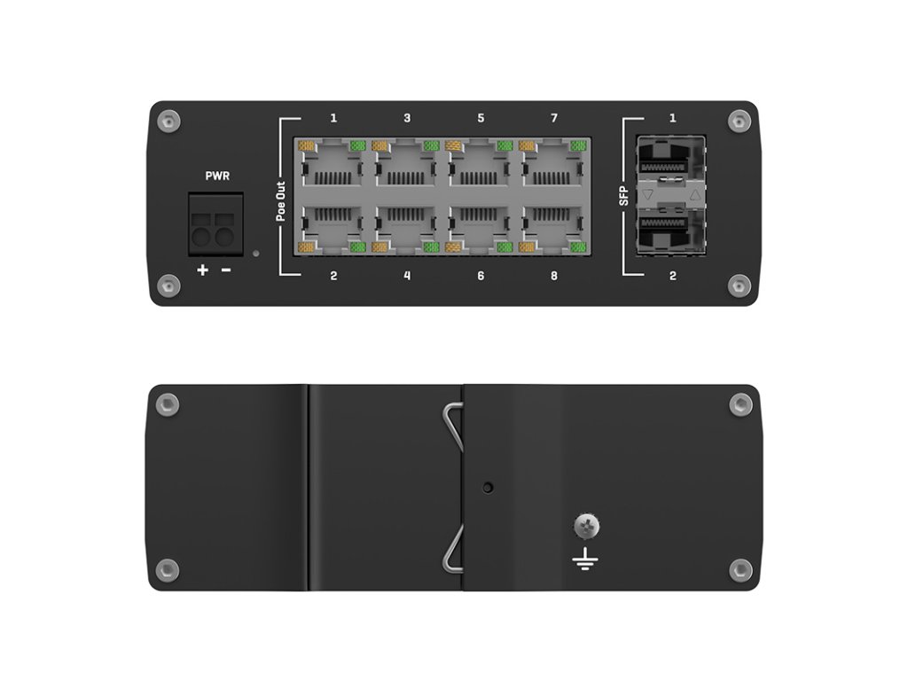 Der Teltonika TSW200 - Industrial Ethernet Switch PoE ist mit zwei SFP-Ports für den Anschluss von Glasfaserkabeln und acht Ethernet-Ports ausgestattet, die die Standards IEEE802.af und IEE802.3at Power-over-Ethernet unterstützen. Robuste industrielle Ethernet Switch Teltonika TSW200 bietet eine zentrale Versorgung von bis zu 240 W (Einzelport bis zu 30 W). Er ist ideal für professionelle Anwendungen mit hoher Bandbreite, bei denen eine zuverlässige Datenverbindung und PoE-Stromversorgung erforderlich sind.